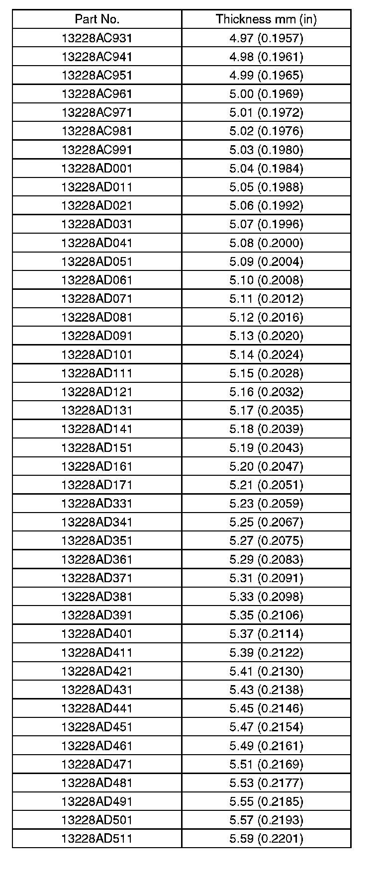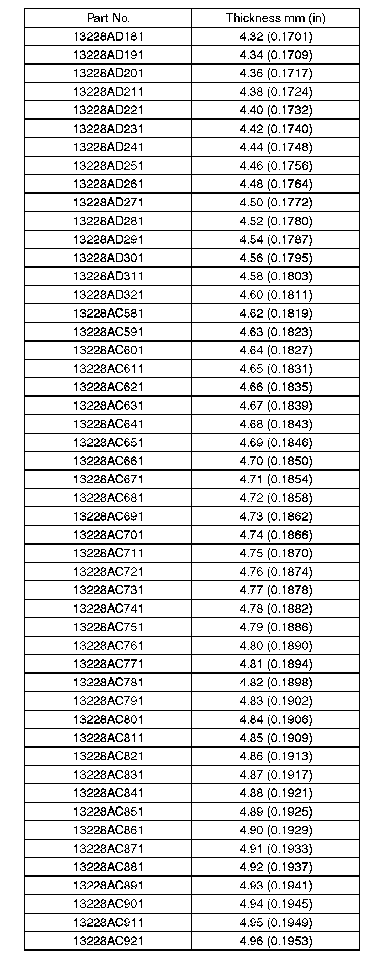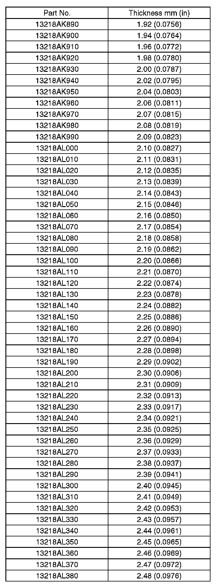 5. Select a valve lifter of suitable thickness from the following table using the measured valve clearance and valve lifter thickness, and install it.