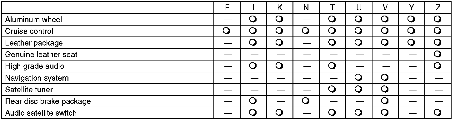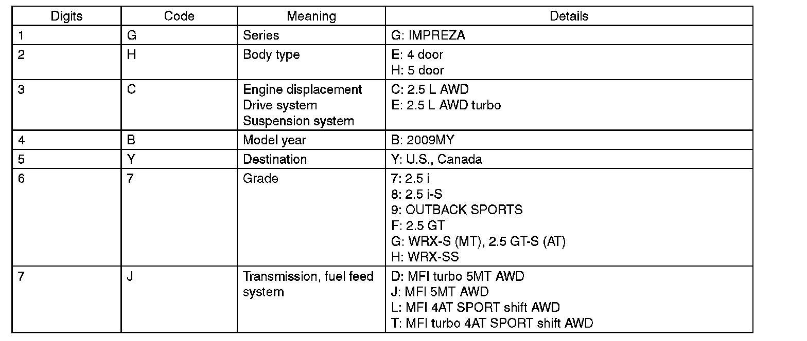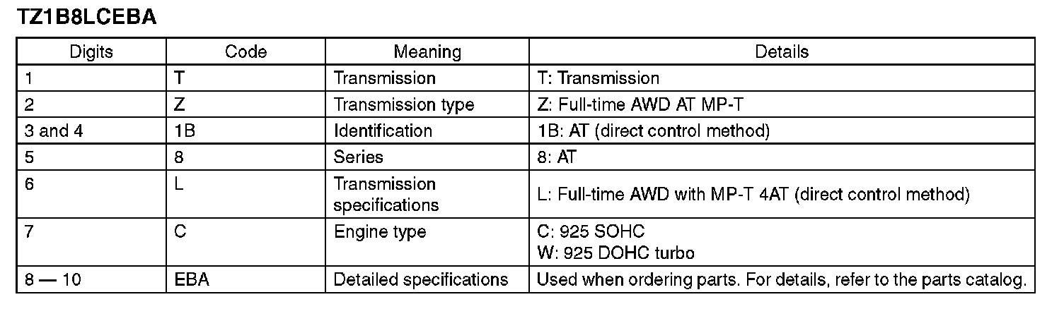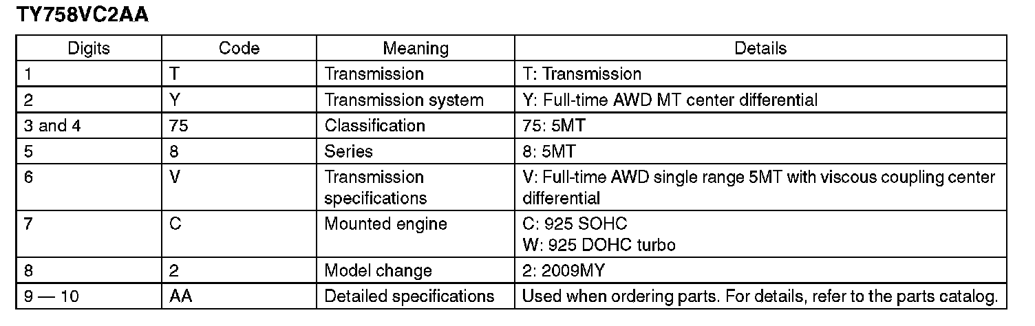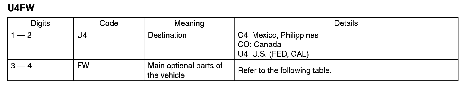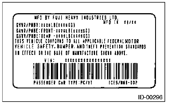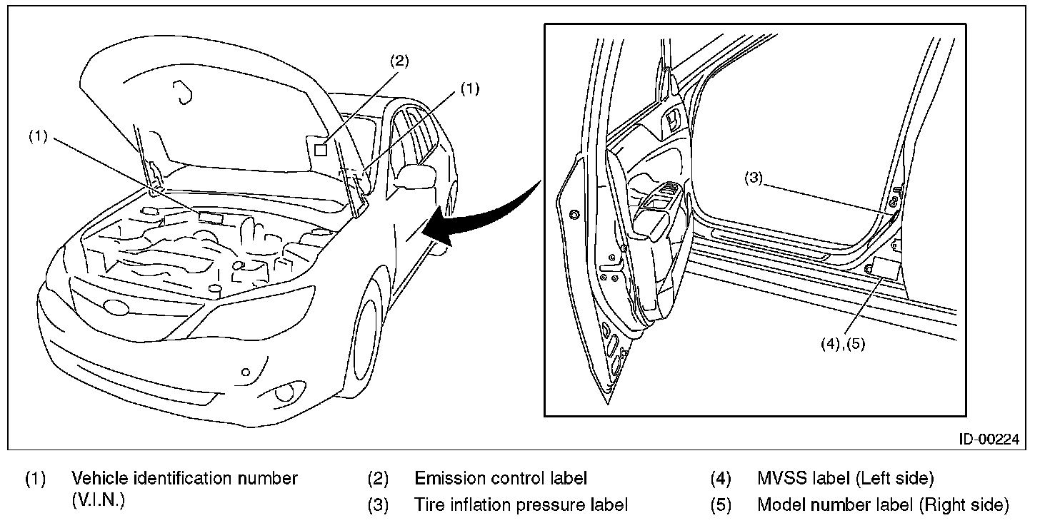 The model number label indicates: the applied model, the option code, the trim code, the engine type, the transmission type, and the exterior color code. This information is helpful when placing orders for parts.