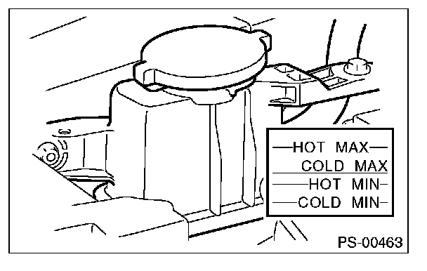 3) Inspect the fluid level of reservoir tank with vehicle on level surface and engine stopped.
