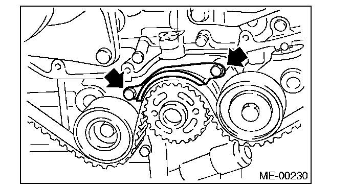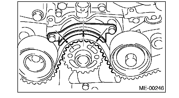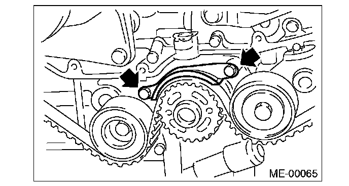 2) Using white paint, put an alignment mark or an arrow mark on timing belts in relation to the crank sprocket and cam sprockets.