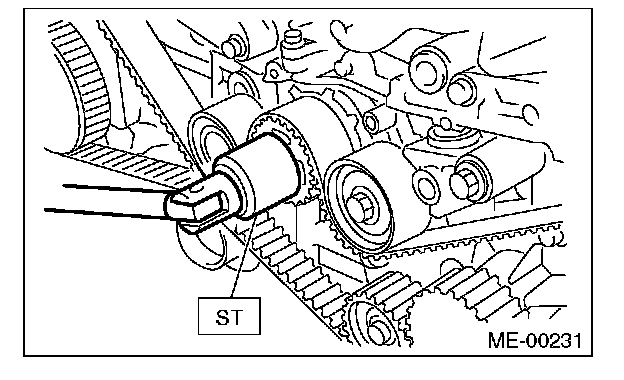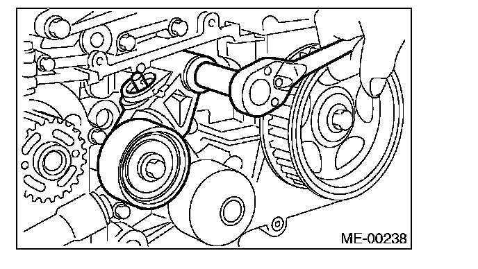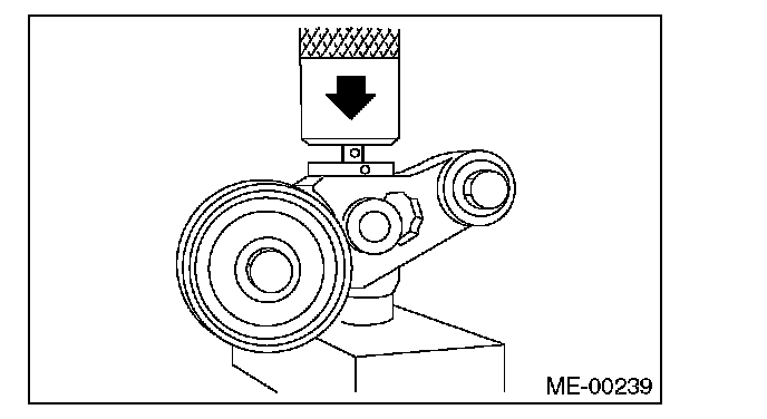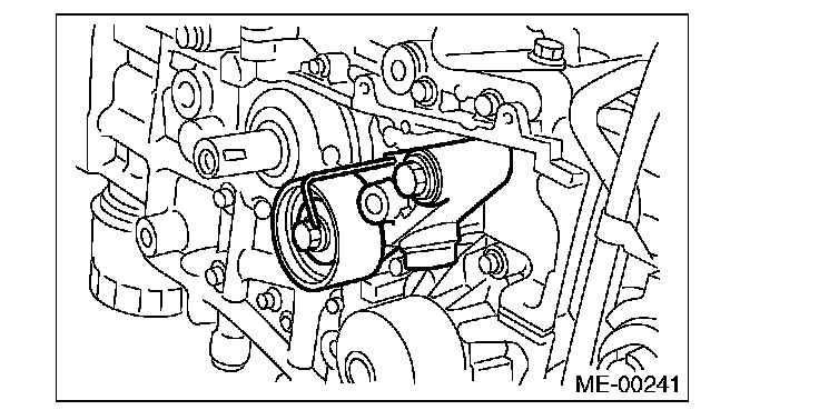 2) Check the belt tension pulley for smooth rotation. Replace the automatic belt tension adjuster assembly with a new part if abnormal noise or excessive play occurs.