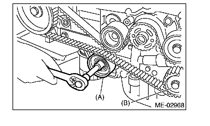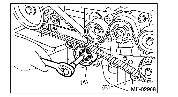 4) While aligning the alignment mark (B) on timing belt with the mark (A) on sprockets, position the timing belt properly.
