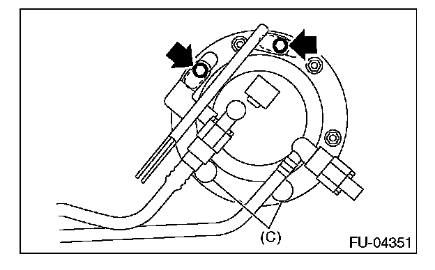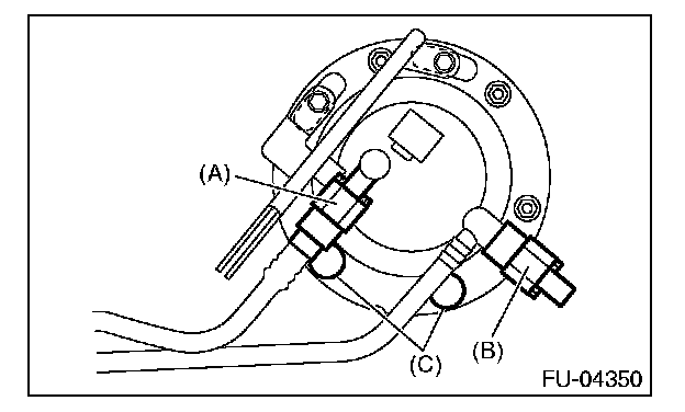 - Align protrusion (B) of the fuel sub level sensor to the cut out in the fuel sub level sensor upper plate.