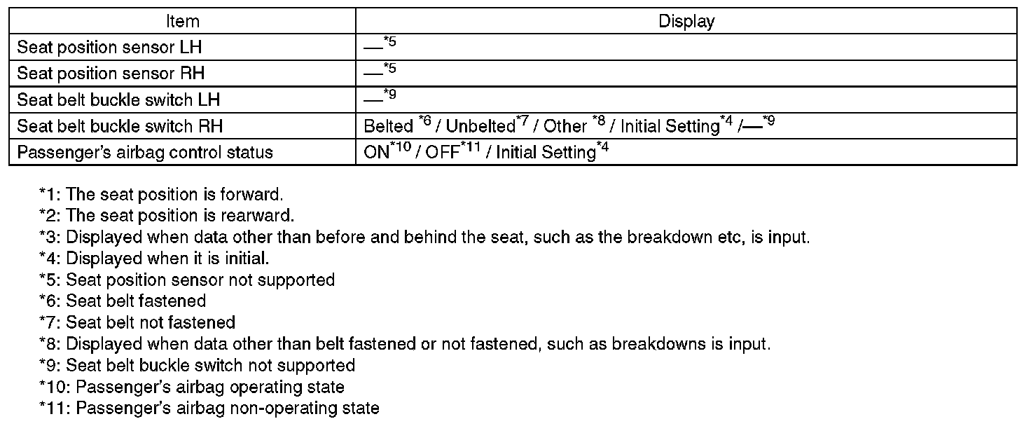 Check the operating condition of each sensor in the event of malfunction in the seat belt buckle switch, when the seat belt buckle switch has been replaced.