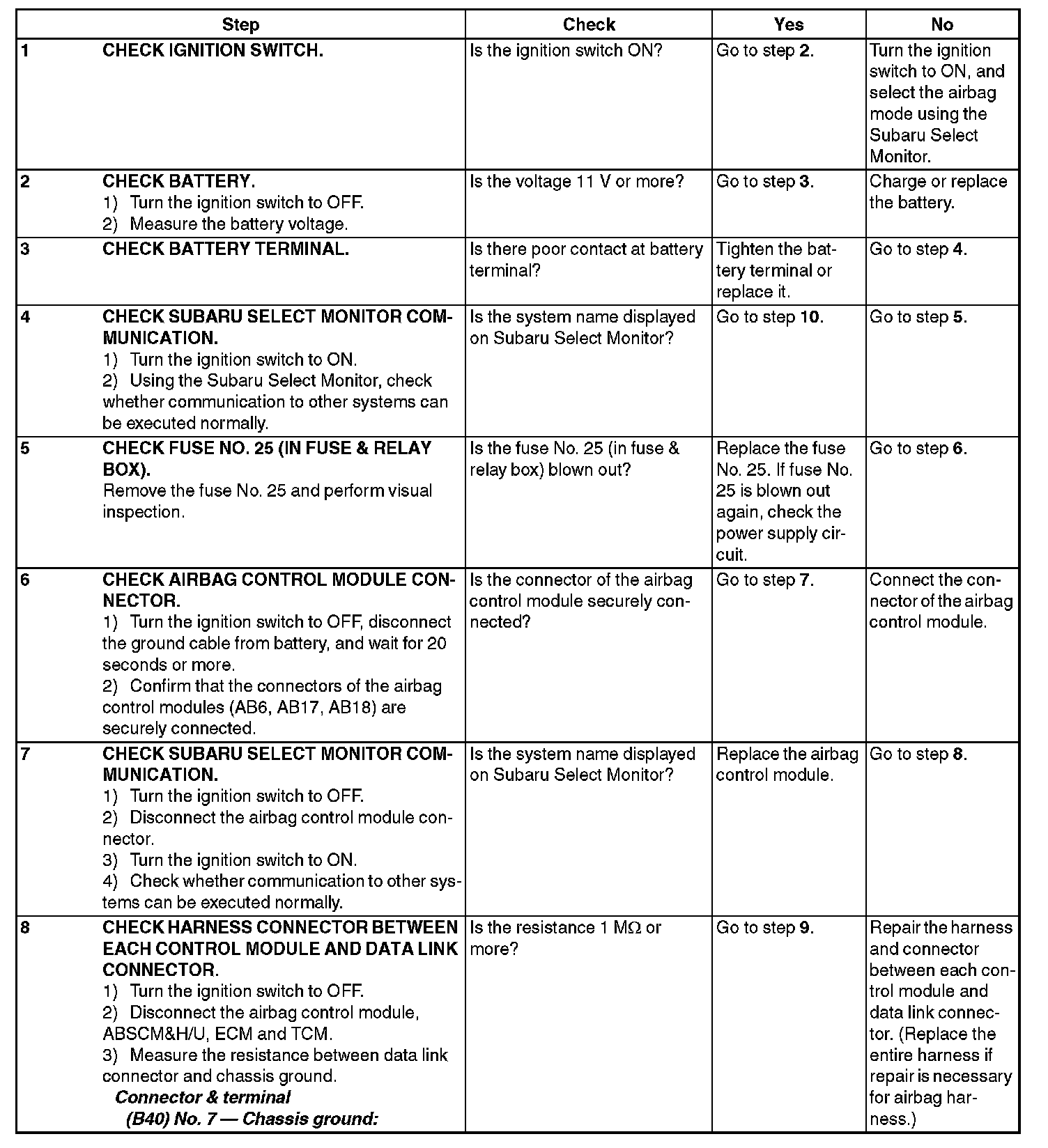 Communication is impossible between the airbag control module and the Subaru Select Monitor.