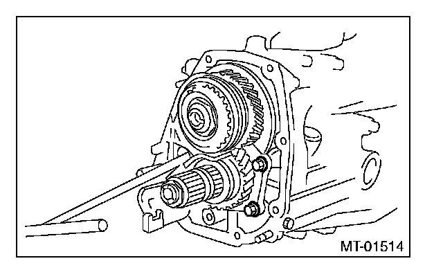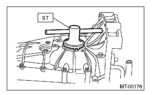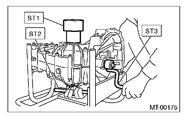 10) Screw the retainer assembly from the bottom into left case using ST2. Fit the ST3 on transmission main shaft. Shift the gear into 4th or 5th, and turn the shaft several times. Screw in the retainer while rotating the ST3 until a slight resistance is felt on ST2.