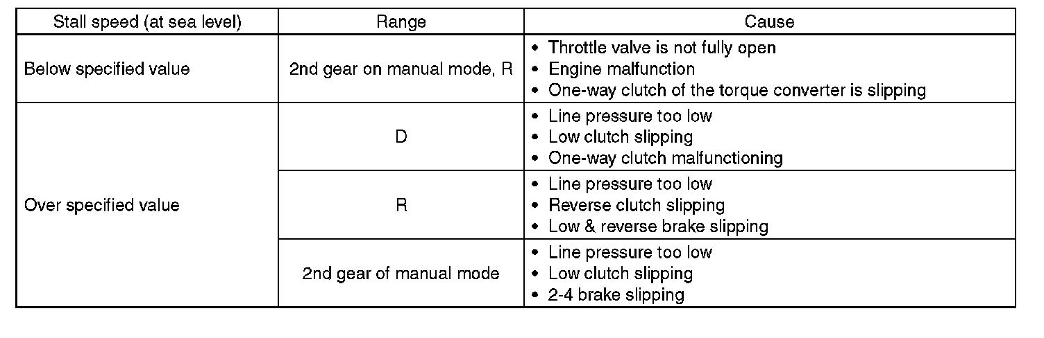 ^ If the stall speed is higher than the specified range, attempt to finish the stall test in as short a time as possible, in order to prevent the automatic transmission from sustaining damage.