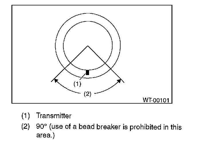 ^ On models equipped with tire pressure monitoring systems, do not use the bead breaker in a 90° area centered on the transmitter to prevent damaging the transmitter.