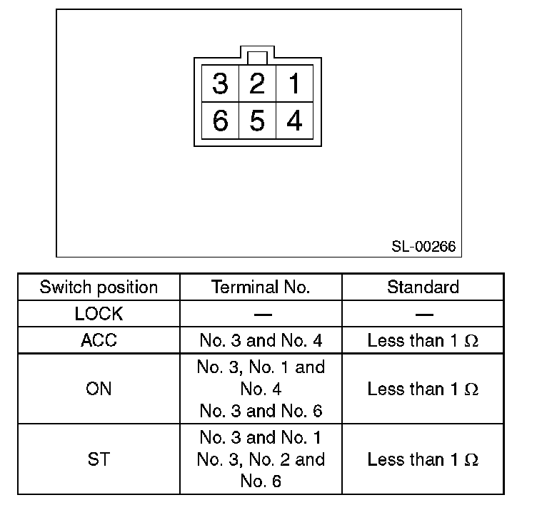 4. Turn the ignition key plate to each position and check the continuity between terminals of ignition connector.