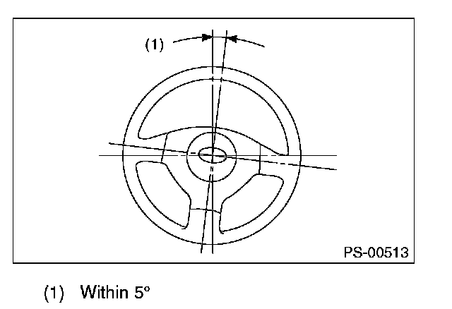 3) If the steering wheel spokes are not horizontal when wheels are set in the straight ahead position, or error is more than 5° on the periphery of the steering wheel, correctly re-install the steering wheel.