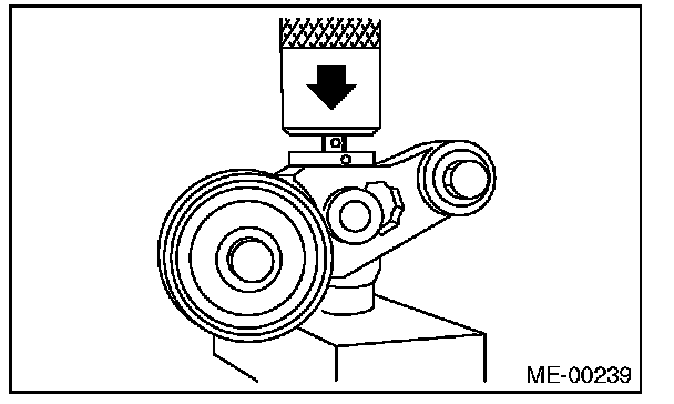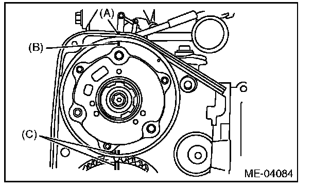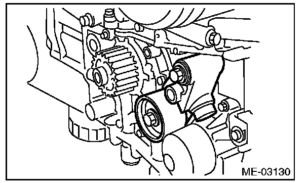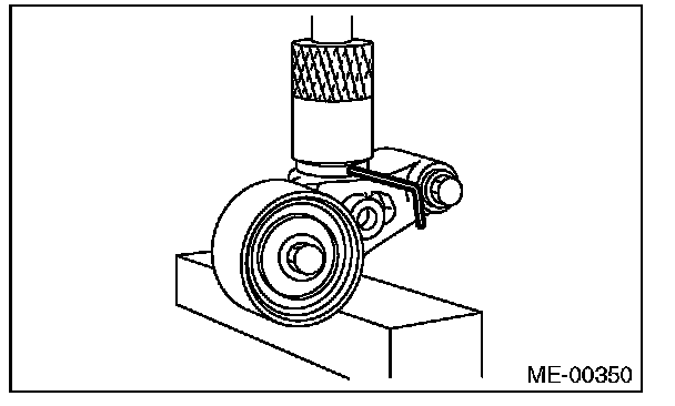 2) Check the belt tension pulley for smooth rotation. Replace the automatic belt tension adjuster assembly with a new part if abnormal noise or excessive play occurs.