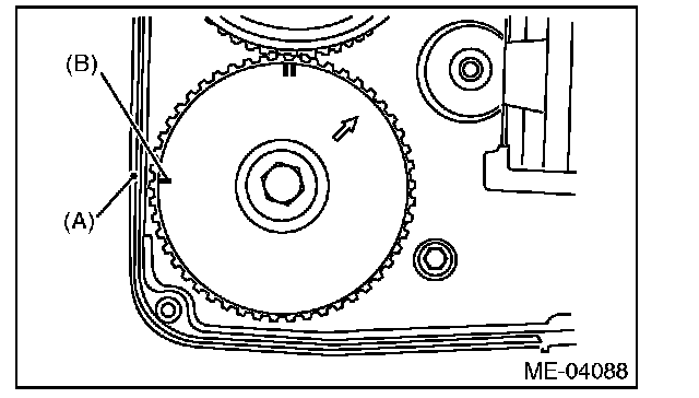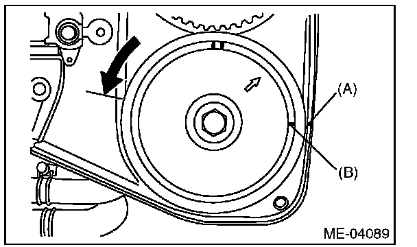 5) Align the single line mark (B) on exhaust cam sprocket LH with notch (A) on the timing belt cover by turning the sprocket counterclockwise (as viewed from front of engine).