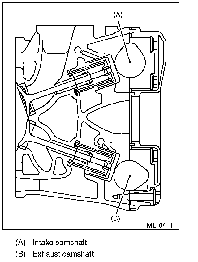 ^ When the camshafts are rotated to install the timing belts, #2 intake and #4 exhaust cam of camshaft LH are held, pushing their corresponding valves down. (Under this condition, these valves are held lifted.) Camshaft RH are held so that their cams do not push the valves down.