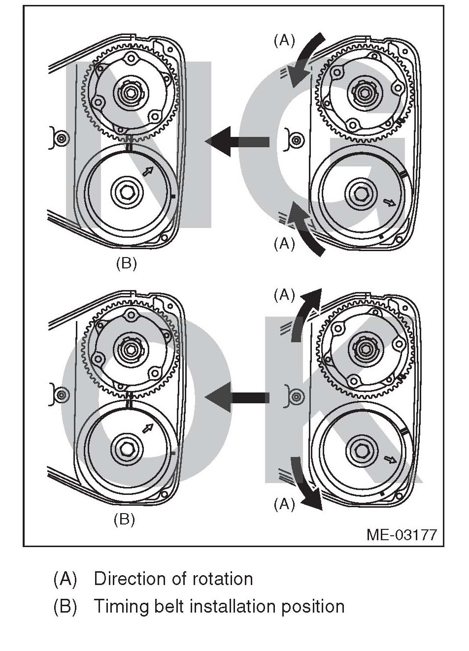 8) Align the alignment mark on the timing belt with marks on the sprockets in the alphabetical order shown in the figure. While aligning marks, position the timing belt properly, and install the timing belt.
