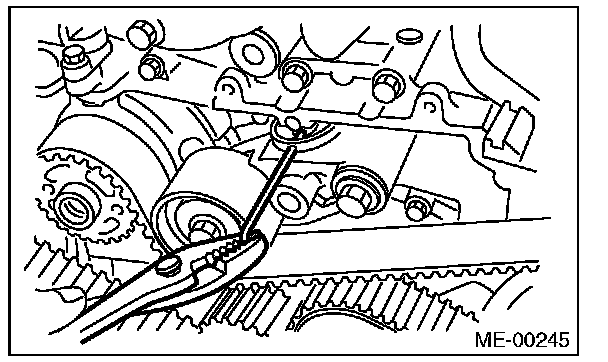 10) After ensuring that the marks on the timing belt and sprockets are aligned, remove the stopper pin from tensioner adjuster.