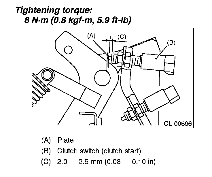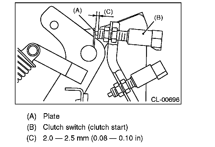 3) Adjust the gap of the clutch pedal plate and the clutch switch to be 2.0 - 2.5 mm (0.08 - 0.10 in).