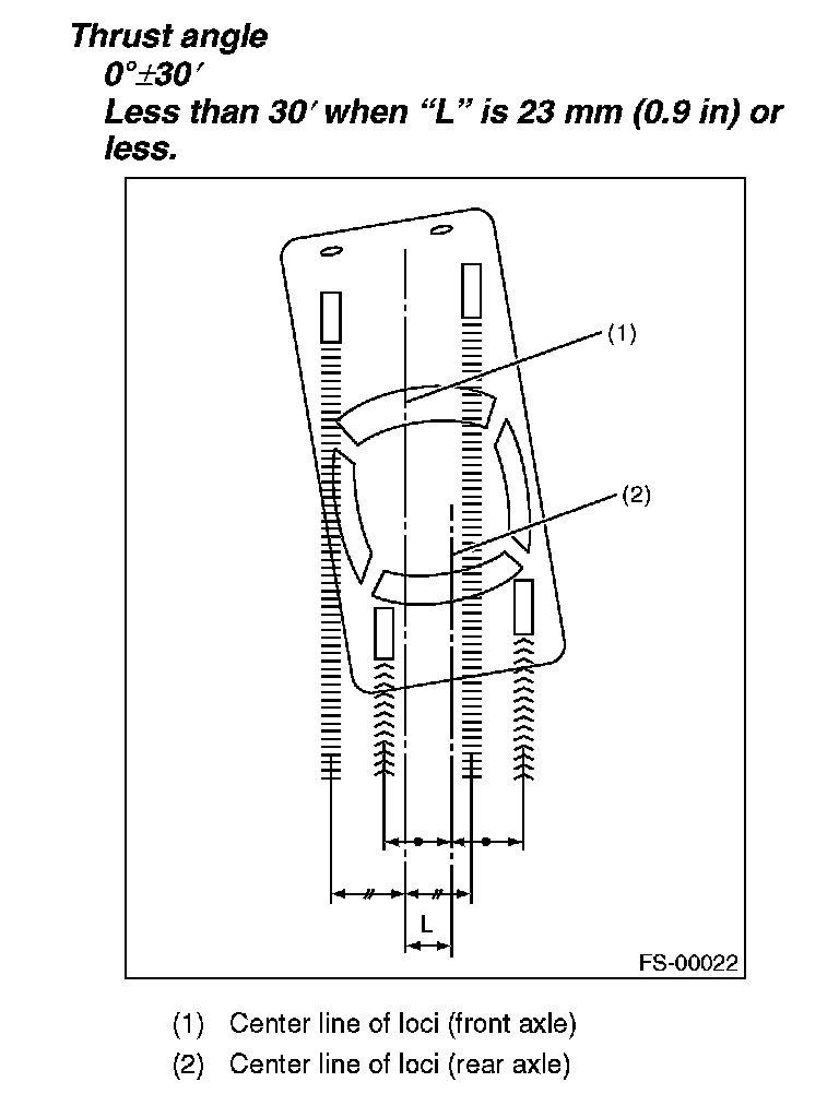 Thrust angle is a mean value of left and right wheel toe angles in relation to the vehicle body center line. Vehicle is driven straight in the thrust angle direction while slanting in the oblique direction depending on the degree of the mean thrust angle.