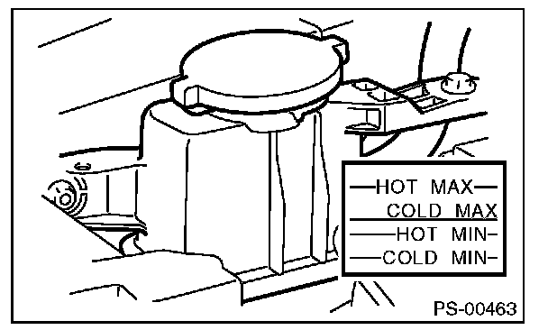 3) Inspect the fluid level of reservoir tank with vehicle on level surface and engine stopped.