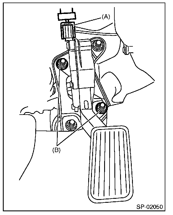 3. Remove the nut (B) securing accelerator pedal assembly and remove the accelerator pedal assembly.