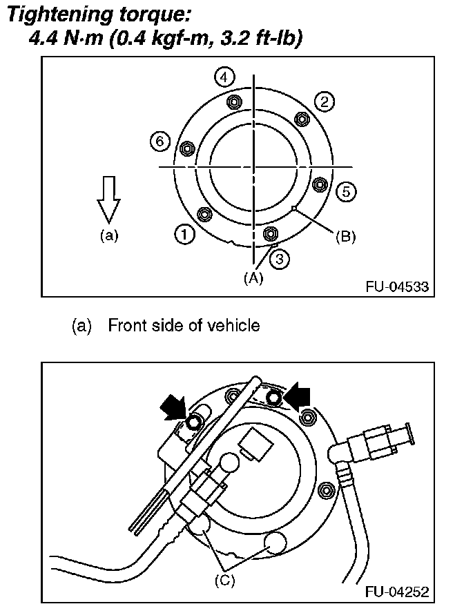 - Align protrusion (B) of the fuel sub level sensor to the cutout in the fuel sub level sensor upper plate.