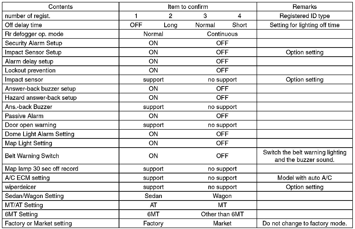 - Confirm key illumination does not blink or "Factory or Market setting" of body integrated unit registrations is "Market". If "Factory or Market setting" is set to "Factory," key illumination blinks when ignition key is turned ON, to notify that the settings are unconfirmed.