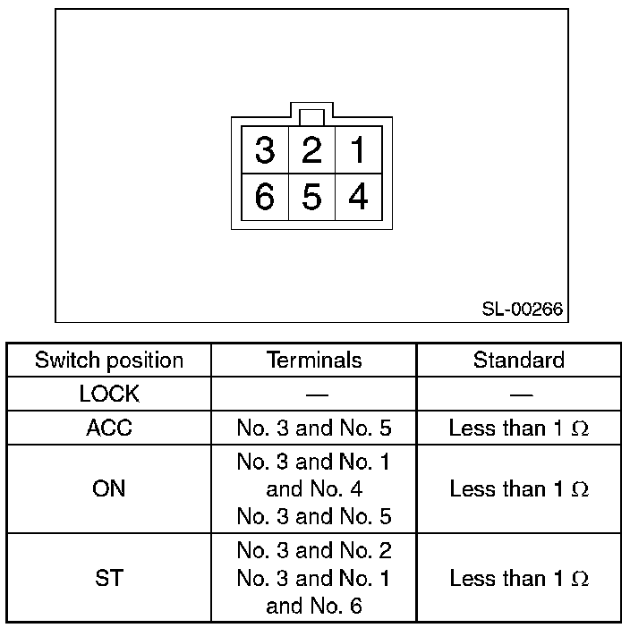 4. Turn the ignition key plate to each position and check the continuity between terminals of ignition connector.