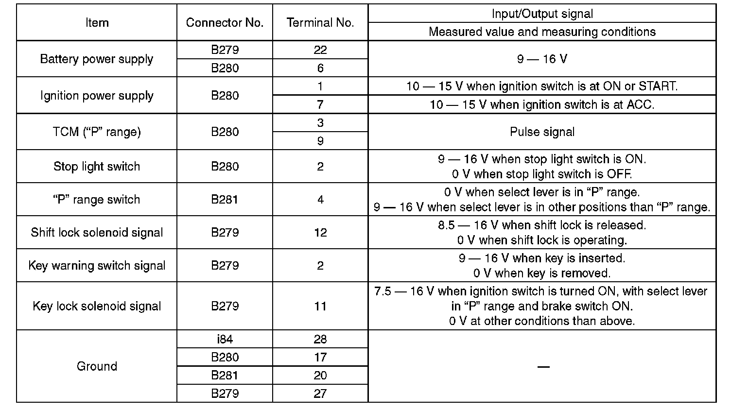 Pinout Values and Diagnostic Parameters