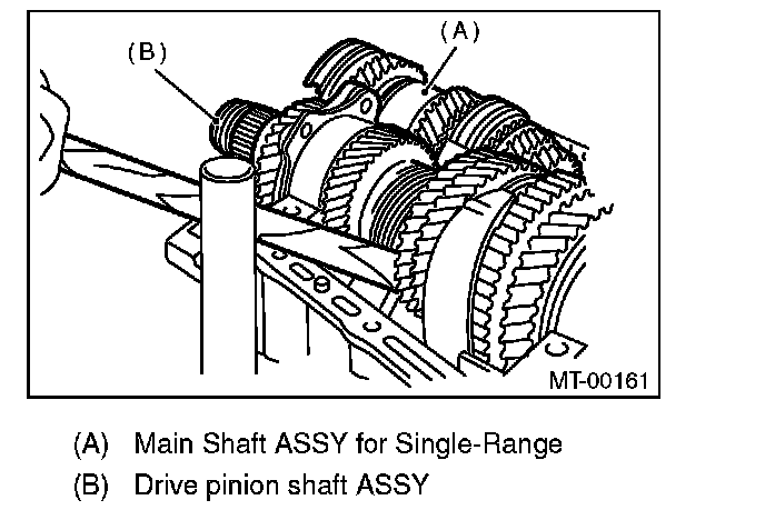 3) Install the main shaft assembly for single-range. Install the transmission case knock pin into the knock pin hole of needle bearing.