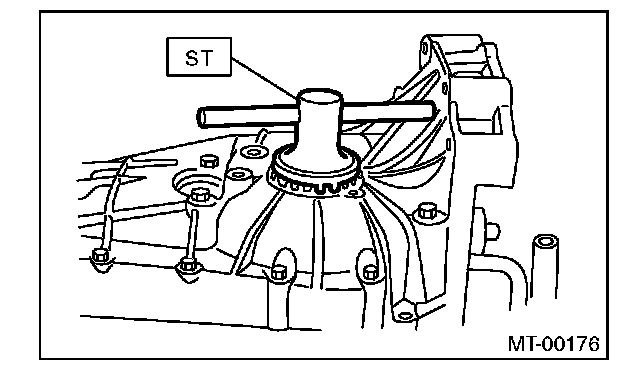 10) Screw the retainer assembly from the bottom into left case using ST2. Fit the ST3 on transmission main shaft. Shift the gear into 4th or 5th, and turn the shaft several times. Screw in the retainer while rotating the ST3 until a slight resistance is felt on ST2.