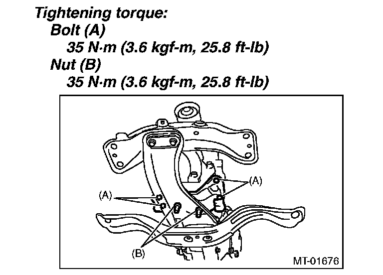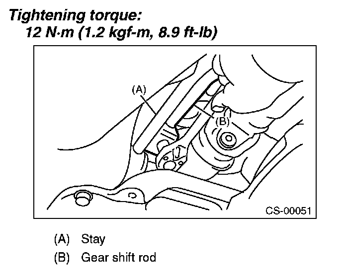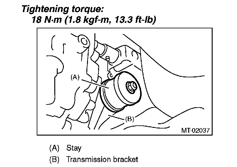 3) Install the transmission cushion rubber to the center crossmember, and tighten the nut (B).