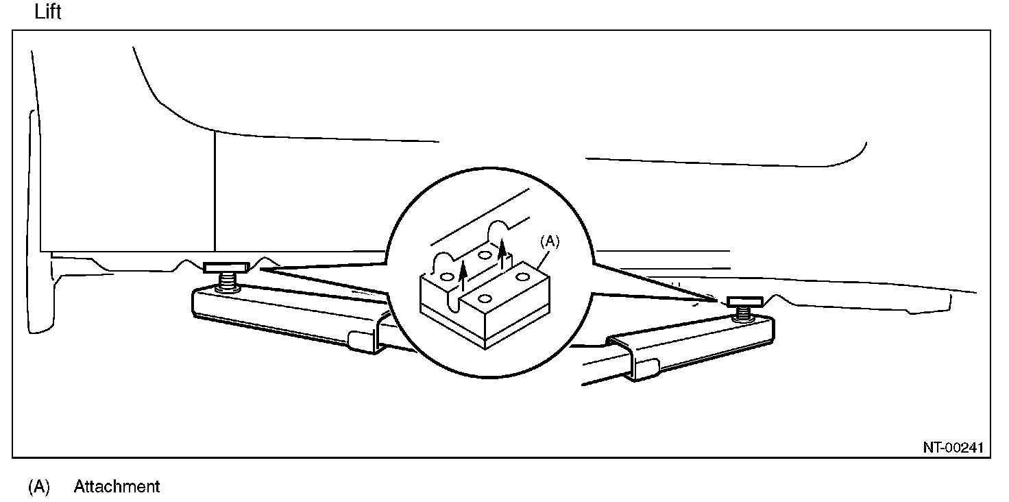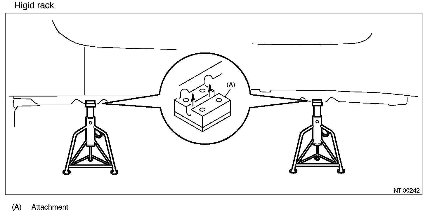 When using a lift or shop jack to raise a vehicle or using rigid rack to support a vehicle, always follow instructions concerning jack-up points and weight limits to prevent the vehicle from falling, which could result in injury. Be especially careful that the vehicle is balanced before raising it. Be sure to set the wheel stoppers when jacking-up only the front or rear side of the vehicle.