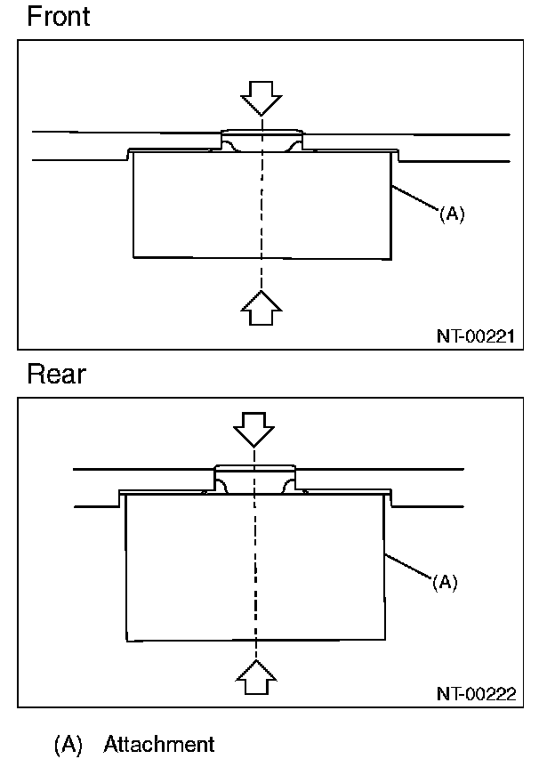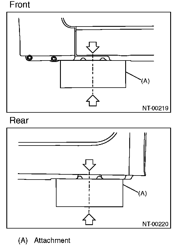 For the models with side sill spoiler, align the center of attachment with the center of vehicle cutout portion (the center of spoiler cutout portion).