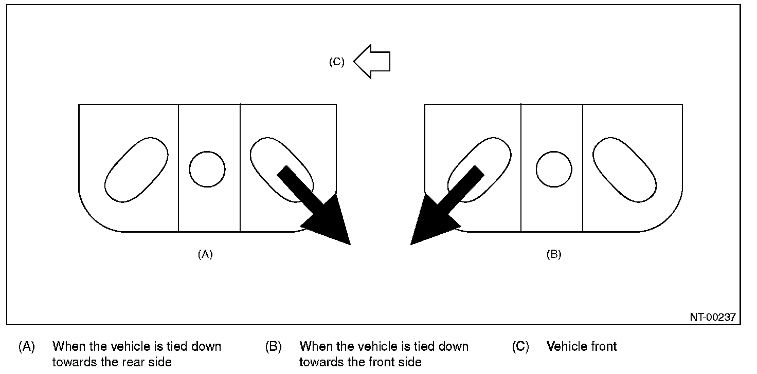 When the vehicle is tied down from the rear side, use the holes at the rear side, and when the vehicle is tied down from the front side, use the holes at the front side.