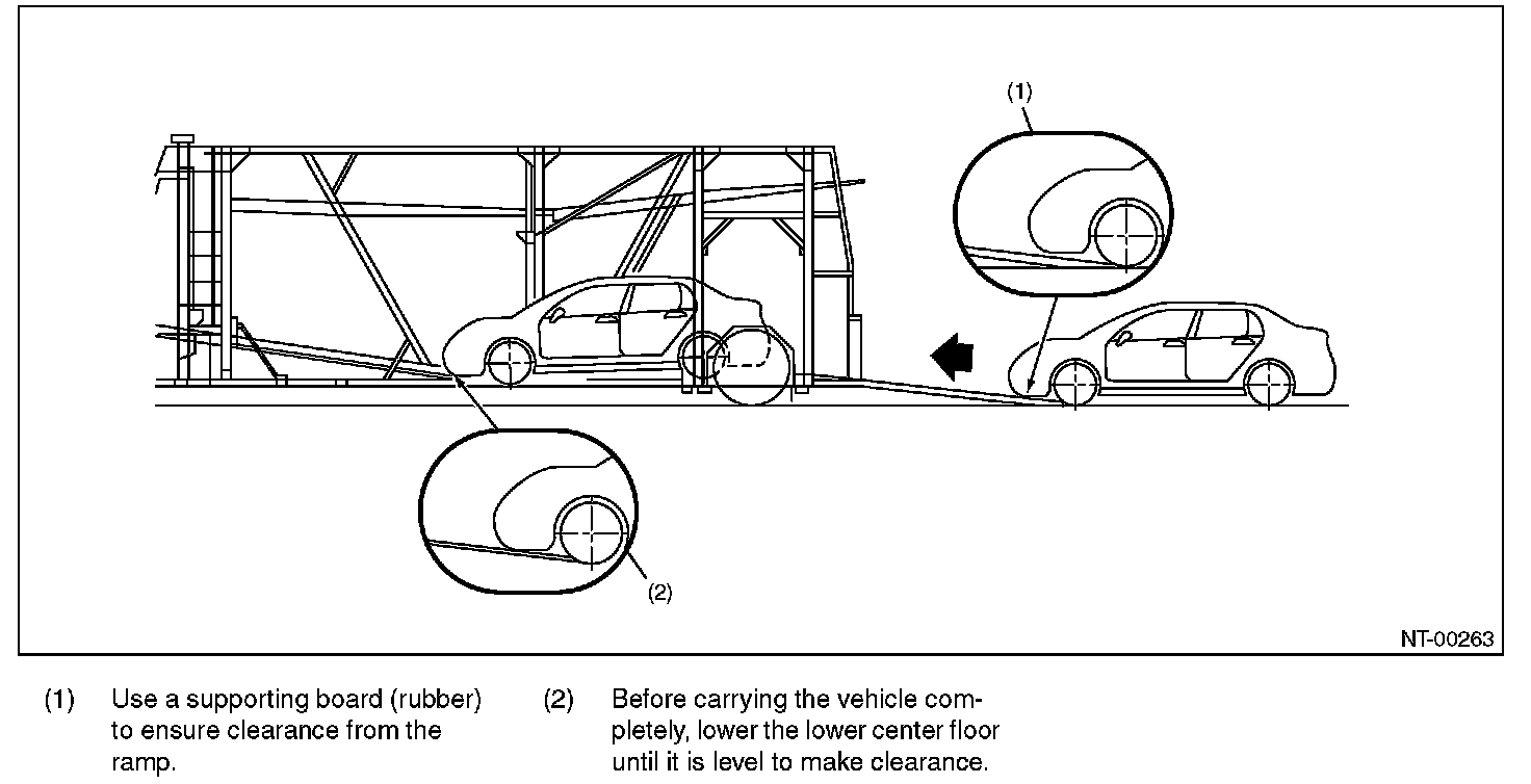 - When carrying the vehicle onto a car carrier truck, perform the operation being careful with the gap between the height of the carrier's floor and the vehicle lower side because of little clearance under the front bumper.