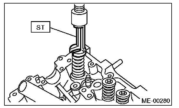 2) Compress the valve spring and remove the valve spring retainer key using ST. Remove each valve and valve spring.