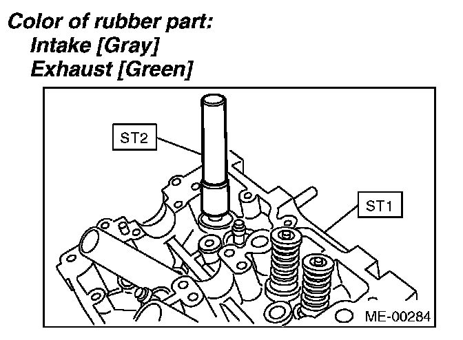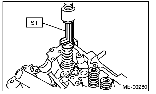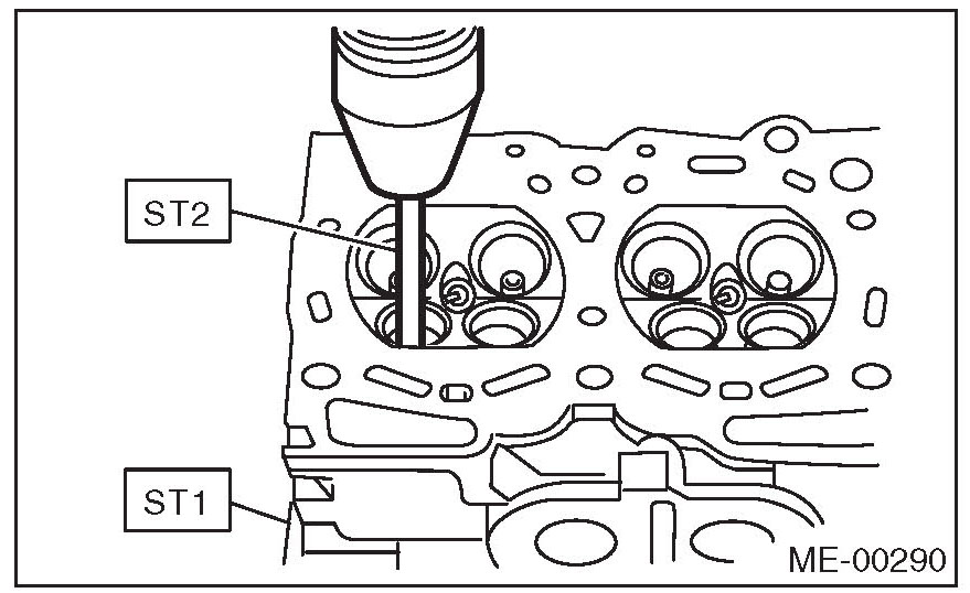 1) Place the cylinder head on ST1 with the combustion chamber upward so that valve guides fit the holes in ST1.
