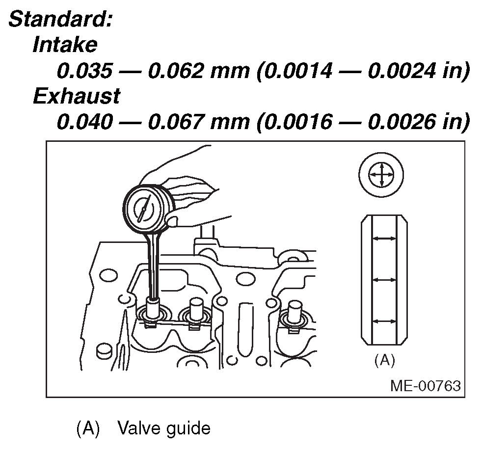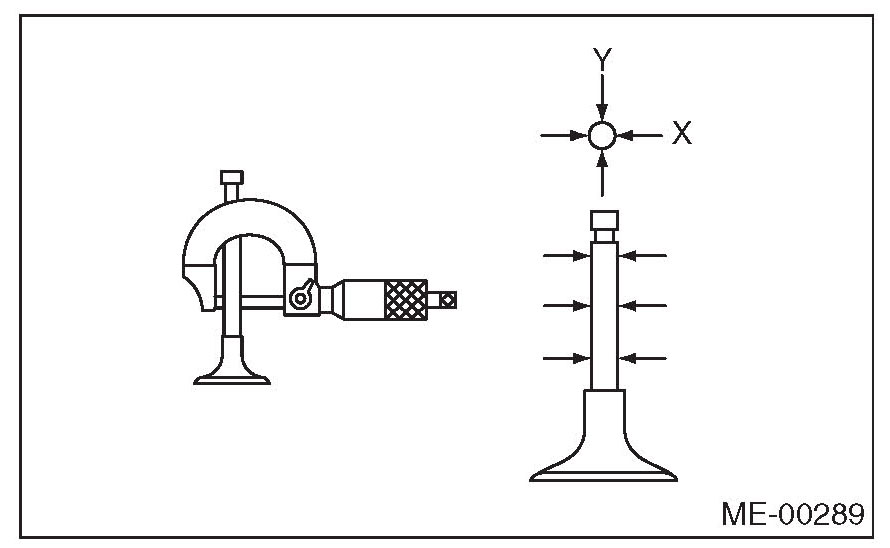 1) Check the clearance between valve guide and valve stem. The clearance can be checked by measuring respectively the outer diameter of valve stem with a micrometer and the inner diameter of valve guide with a caliper gauge.