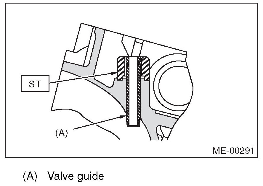 5) Put anew valve guide, coated with sufficient oil, in the cylinder head, and insert the ST1 into valve guide. Press in until the valve guide upper end is flush with the upper surface of ST2.