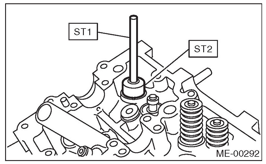 2) Place the cylinder head on ST1, and use ST2 to press-fit the oil seal.