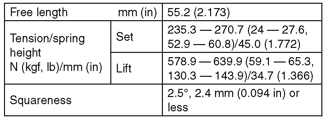 1) Check the valve springs for damage, free length, and tension. Replace the valve spring if it is not within the standard value presented in the table.