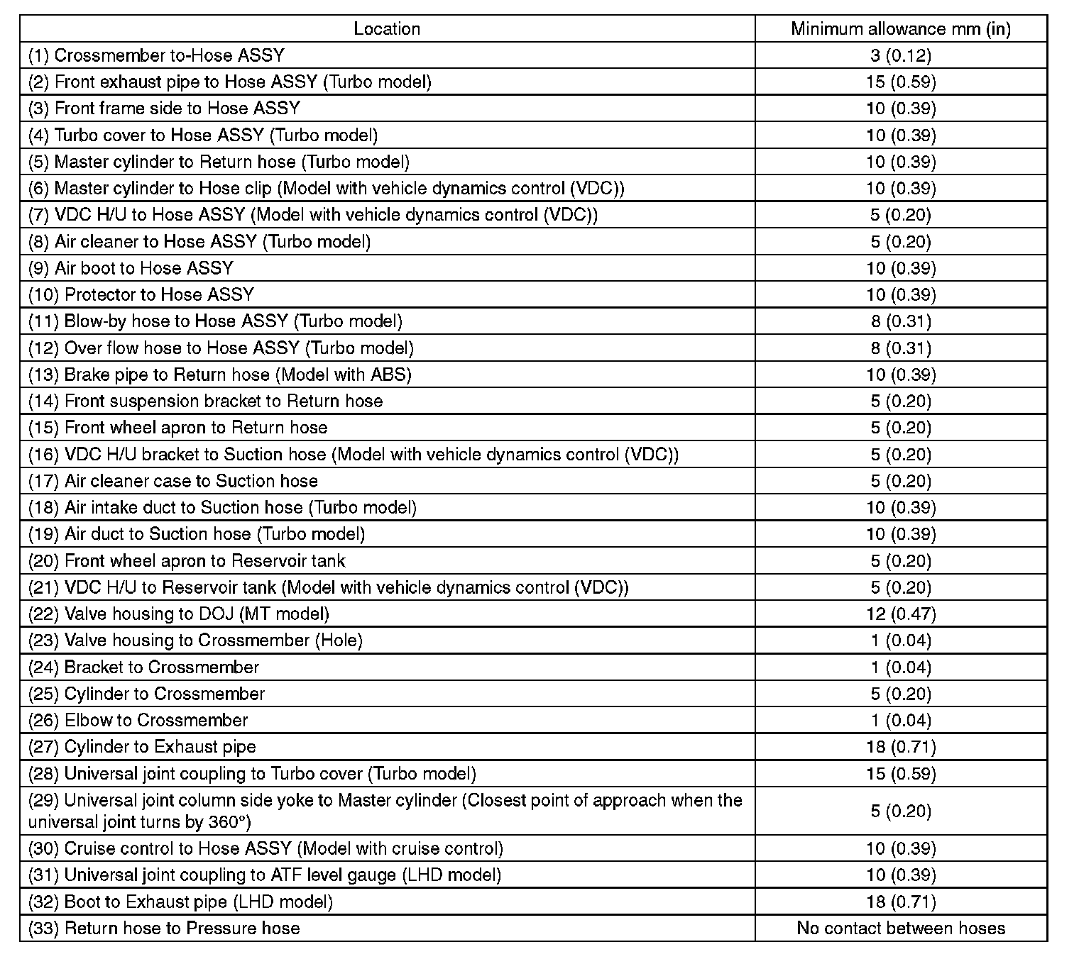 This table lists various clearances that must be correctly adjusted to ensure the normal vehicle driving without interfering noise, or any other faults.