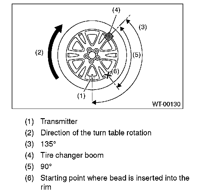 ^ Set the tire changer boom to the position shown in the figure so as not to damage the transmitter.