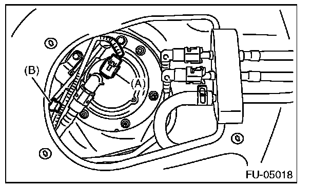 6. Disconnect the connector (A) from fuel sub level sensor, and remove the clip (B) securing the fuel cord from fuel sub level sensor protector.
