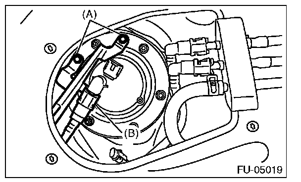 - Align protrusion (B) of the fuel sub level sensor to the cutout in the fuel sub level sensor upper plate.