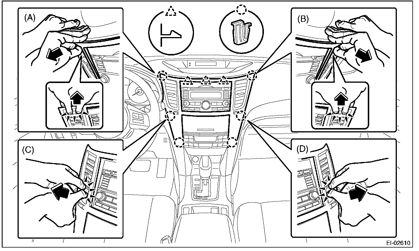 3. Insert a finger into the air vent grille and release the left and right clips at the center of the center panel. (C), (D)