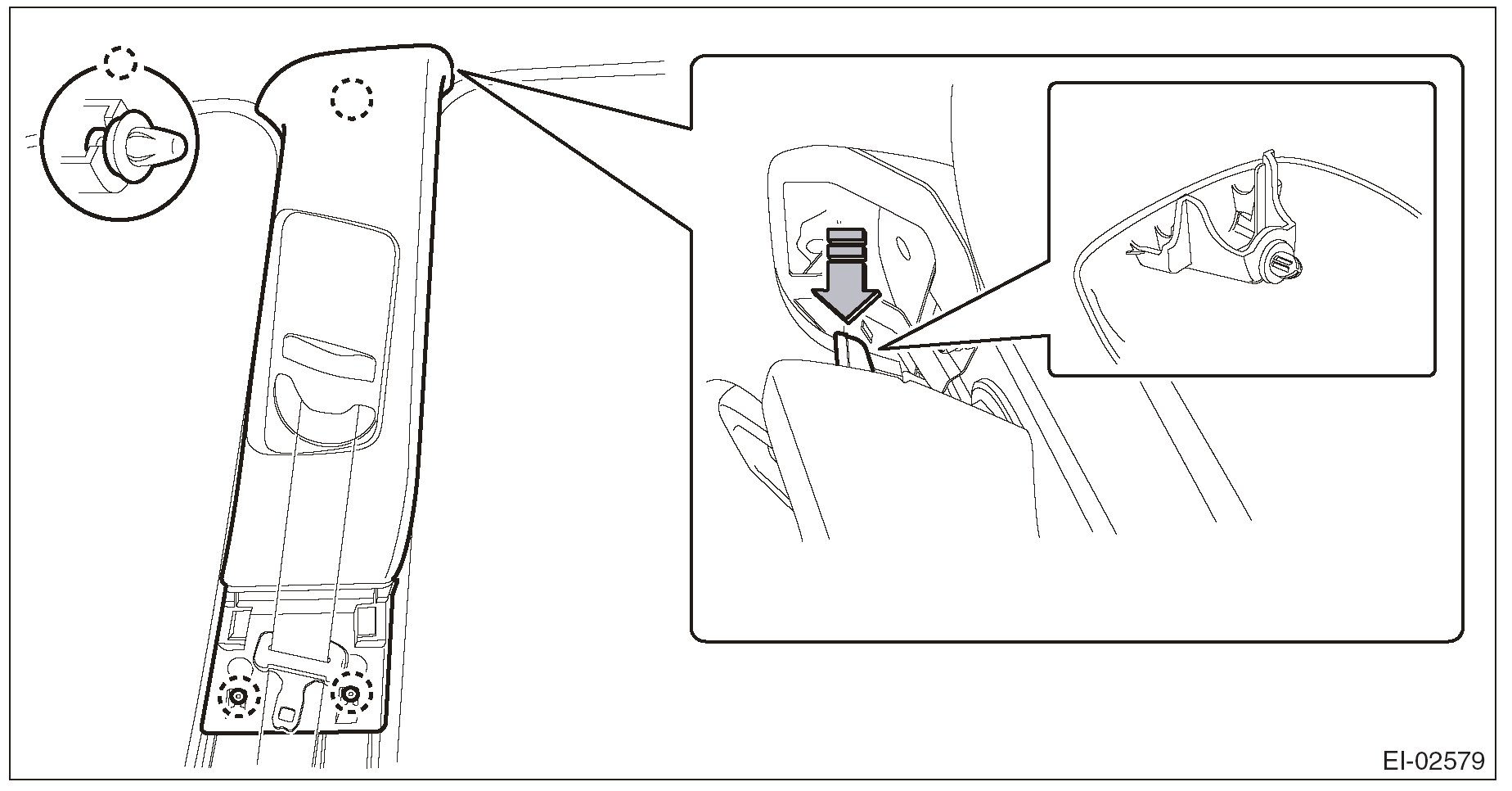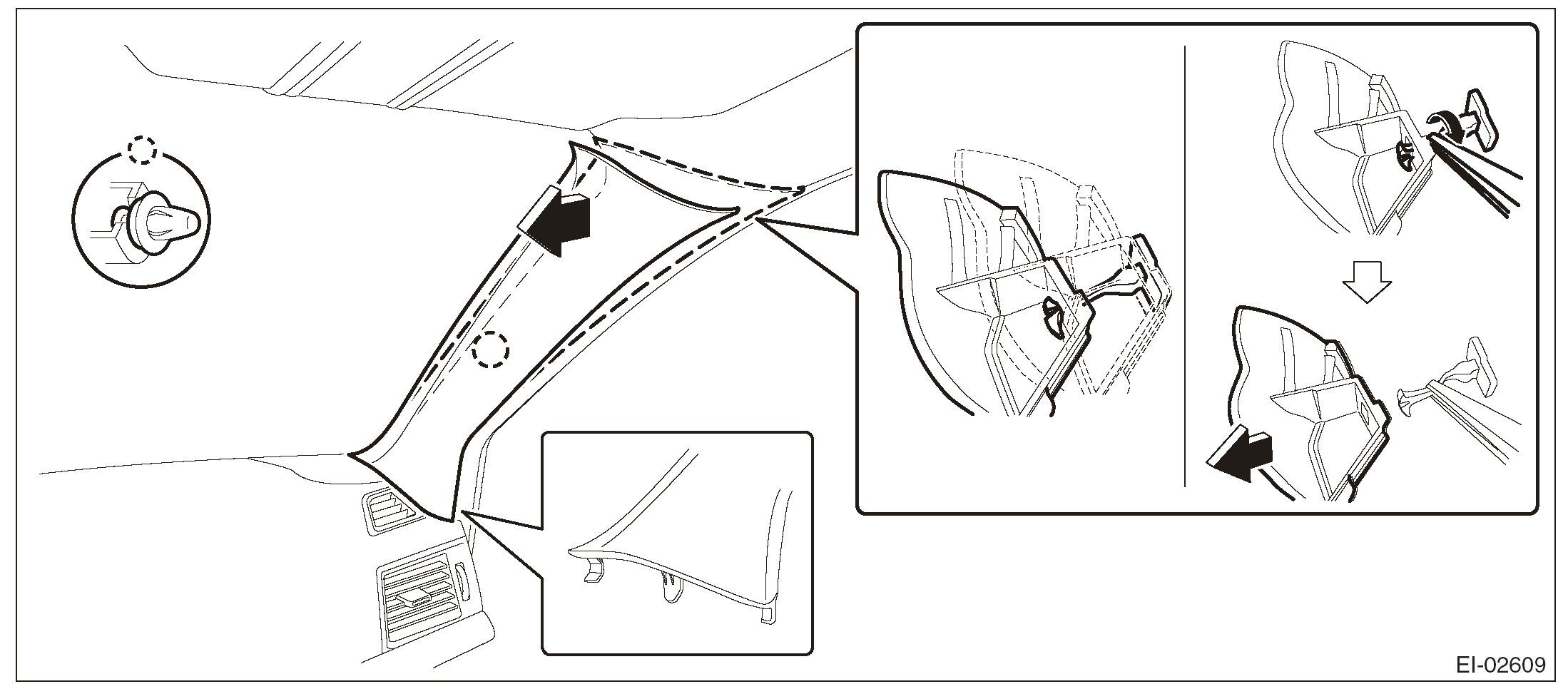 1. Pull the upper part of the front pillar trim towards the center of the vehicle.