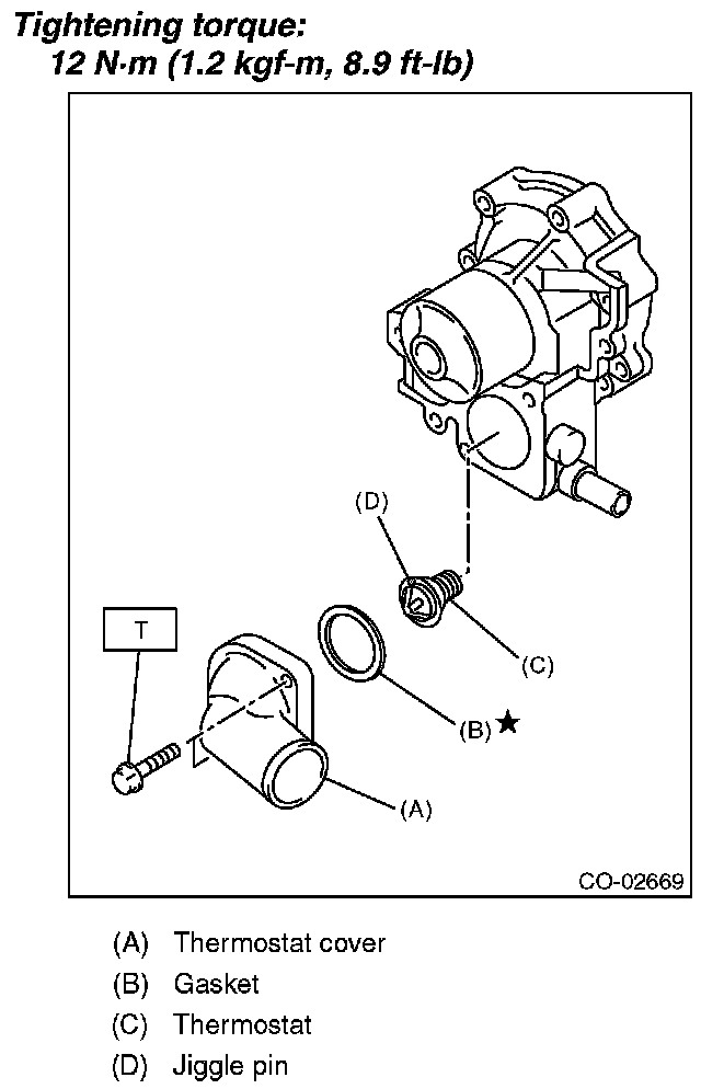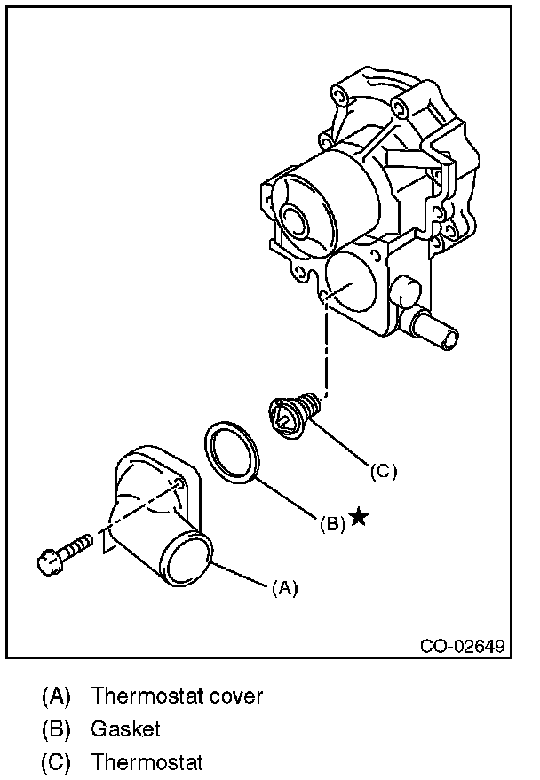 5) Remove the thermostat cover, and then remove the gasket and thermostat.