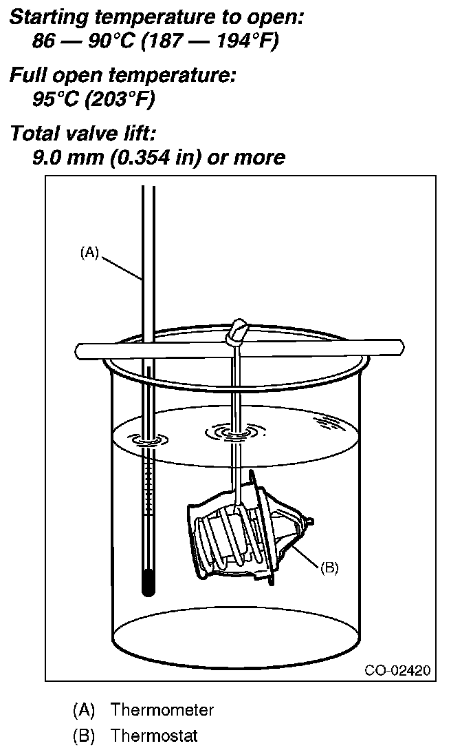 3) Immerse the thermostat and a thermometer in water. Raise water temperature gradually, and check the temperature and valve lift when the valve begins to open and when the valve is fully opened. Replace the thermostat if faulty.