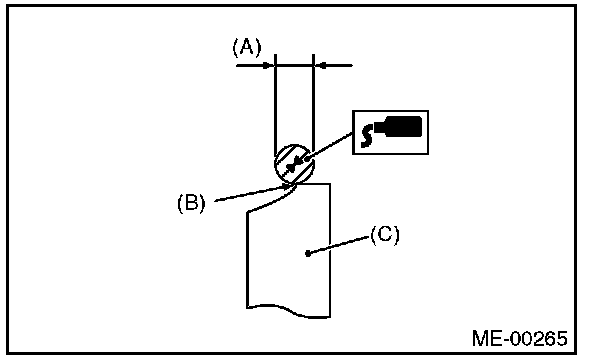 Apply a coat of liquid gasket of 3 mm (0.12 in) in diameter (A) along the edge (B) of camshaft cap (C) mating surface.