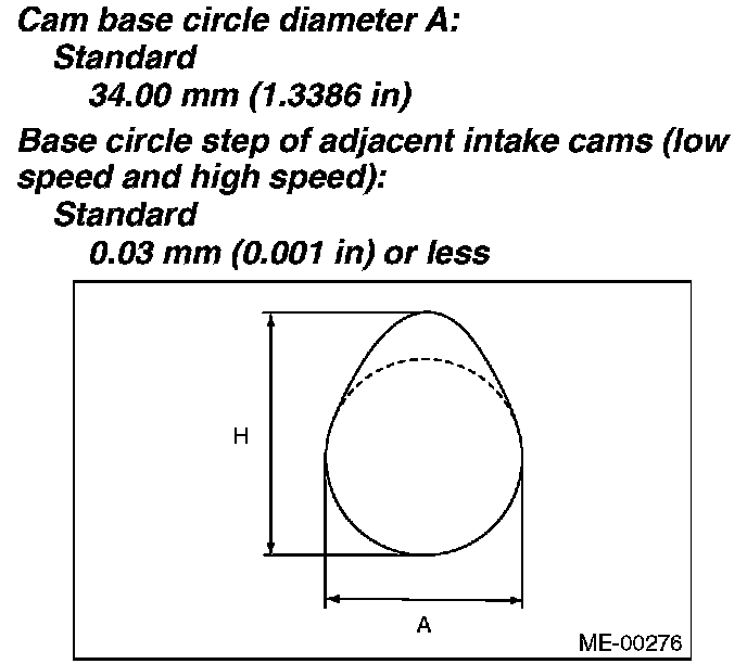 4) Measure the Cam height "H", Cam base circle diameter "A", and base circle step of adjacent intake cams (low speed and high speed). If it exceeds the standard or offset wear occurs, replace it.
